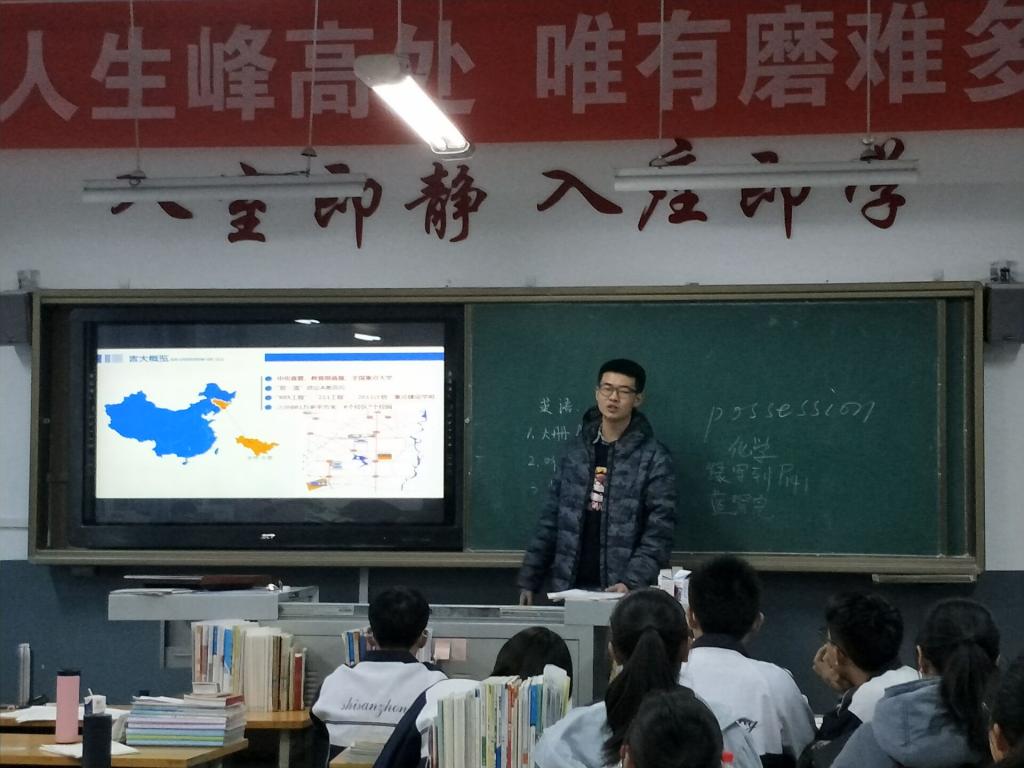同一时间,位于吴忠市的孙阳、海陆空等同学在吴忠中学进行了宣讲。他们采用了视频和PPT的形式,先向学弟学妹们播放了吉大的宣传视频,后根据PPT进行了宣讲,最后向学弟学妹们分享了学习经验,并在学习方面对他们给予了鼓励。