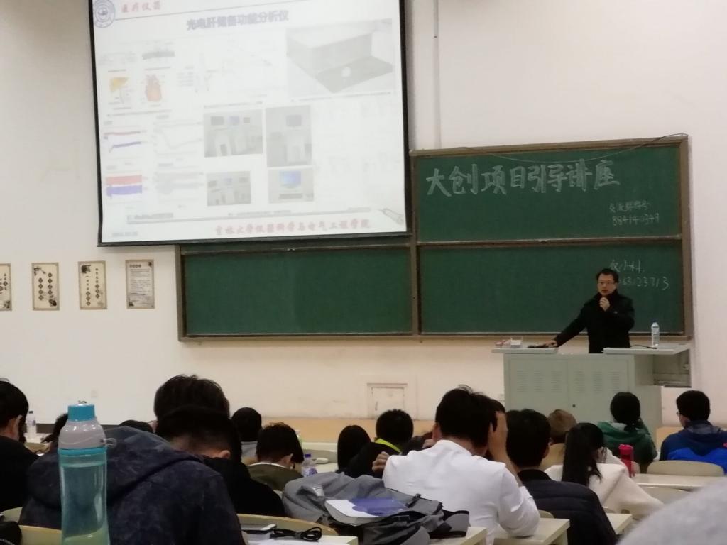 首先,千承辉老师对大创项目的流程进行了简要介绍,强调了大创项目的申请条件。随后引导讲座切入正题,王智宏老师介绍了她的研究方向:光谱技术、精密测量技术、快检技术、重力感应技术和机器人方向,之后又对她的两个大创项目:“地面自动寻位全量程辐射定标装置”和“基于细分的电压/电流高精度检测系统” 进行讲解,在比较容易出现疑问的部分,老师以图解的方式带领同学们一起思考,加深了大家对项目的理解,使学生们收获匪浅。接着王世隆老师介绍了自己的课题:“基于飞行平台的软硬件设计需求”,分别从时空域航空电磁探测仪器系统研发的直升机平台和多频复信号电磁探测仪器系统研发的无人机平台两个方向全面讲解了飞行器平台的原理和设计理念,并表示很愿意吃苦耐劳、勤奋努力的学生加入他的团队。随后蔡靖老师登台,介绍了刘光达老师带队的医学仪器特色的大创项目:穿戴式人体生理参数检测仪器、光电肝储备功能分析仪、EEG-NIRS脑机接口与疾病检测以及人体微信号检测算法,从人体运动科学、运动生理学和运动医学层面上详细解释了各个项目的内容和未来研究方向,蔡靖老师以趣味性的讲解引来同学们的阵阵掌声,将引导讲座的气氛推向高潮。在同学们的掌声中,接着随阳轶老师走上讲台直入主题,讲述了自己的项目:“守护颈椎的智能眼镜”和“机器鱼的磁干扰补偿研究”,以通俗易懂的语言分析了这两个项目的研究内容,并且将较难理解的机器鱼项目类比无人机的相关模块进行详细介绍。之后,介绍了以地学部地学特色为主的“磁共振地下水探测”项目,又给同学们提供了一个新的选择。整个引导讲座过程中,千承辉老师也不时参与进来,提出自己的看法。