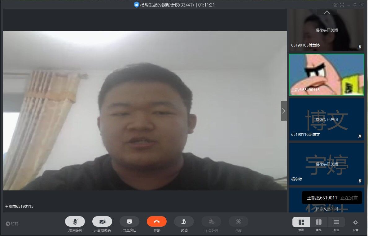 期末在即,为帮助同学们在疫情期间树立正确的学习态度,解决同学们的学习困难,掌握适合自己的学习方法,培养良好的学习习惯,651901班于2020年5月26日晚19:30利用钉钉直播开展“仪电少年,‘疫’起学习”主题班会,本次班会由班长杨明主持,并邀请到651901班班主任王智宏老师、郑凡老师以及辅导员马姗姗老师出席班会。